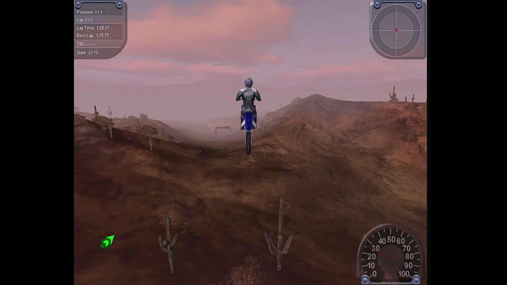 Let’s start with the good stuff. The soundtrack is fantastic. A lot of late 90s and early-2000s racing games had great music, and this one definitely fits that trend. Another plus is the variety of bikes, there are plenty to choose from, though I’m not convinced they make much difference in gameplay. I didn’t notice any, personally. The graphics are decent for the time, but the environments feel a bit empt. Mostly wide-open fields and barren terrain.